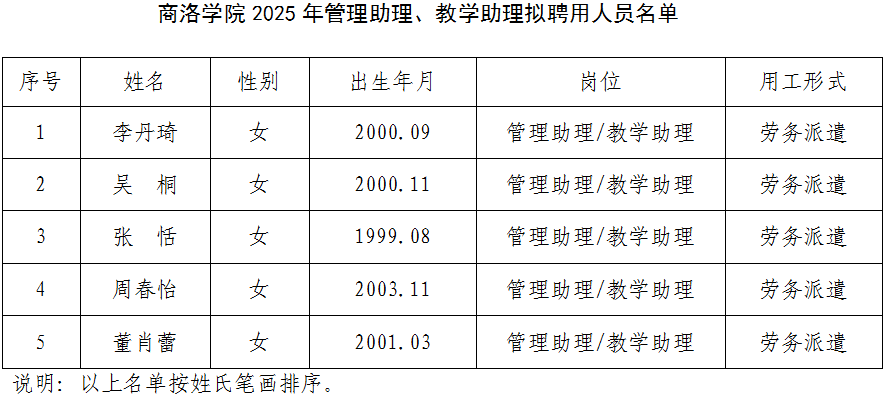 附件:商洛学院2025年管理助理、教学助理拟聘用人员名单